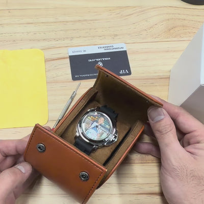 A leather box, tools, and a warranty card are included.